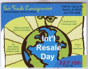 International Resale Day is July 18 every year. A date specifically chosen so that each resale, consignment, or thrift store can focus on either summer clearance or fall/ back-to-school promotion…and because mid-July tends to be, for most places, a real slow time of year when a little festivity and some excited shoppers would be most welcome.