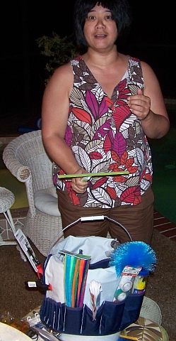 After much trading and cutting and sticking, the entries were voted on and Smokey Joe’s, by Marriette won…but only after a tie with Julie’s Tiny Dancer display! The tie was broken by their creating a theme song for their imaginary shop. Here she displays, for your enjoyment, the squeegee from the Display Diva Bucket she won. Everyone agreed this would be a perfect activity for a staff gathering in their shops, so this may be the birthplace of a new employee-bounding tradition as well as a fun evening for resale shopkeepers themselves. Thanks Cynthia!