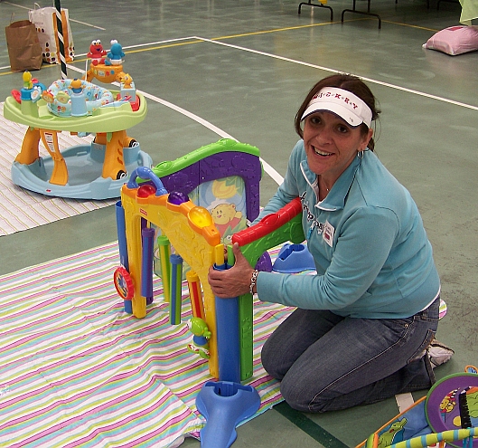 Signage is of prime importance in a temporary store, of course. Signs on racks, signs above the slanted shelving (bleachers, in the photo!) holding laundry baskets labeled toddler sox or feeding equipment, signs on PVC-pipe stands saying potty seats and so on. Since consignors place their own items on the sales floor, these signs must be explicit: outdoor toys is not the same place as bikes and riding toys.