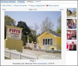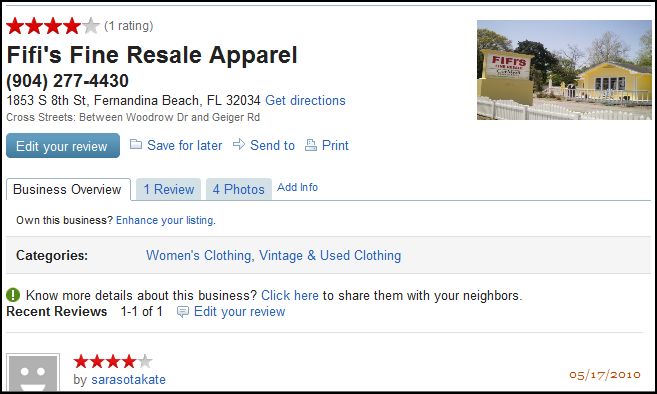 I’m going to take advantage of a “breezy” visit last week to Fifi’s Fine Resale Apparel in Amelia Island and owner Jessica’s good nature to use a blank/ dormant/ unattended review of her shop just to give you an idea of the difference it can make. Here’s what I was presented with when I asked Yahoo Local for consignment in Amelia Island then clicked on her shop name: