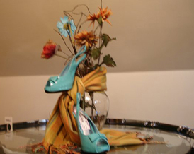 Remember height: the vase. Remember the triangle: shoe, shoe, flowers. Remember to do something unexpected: turquoise and pumpkin, so MUCH more eye-catching and memorable than, say, black and red.