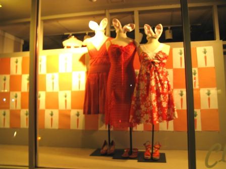 Easter windows can look, well, a bit too sweet for the true fashionista. Not their style. Because Clothes Circuit in Dallas knows this, they choose to highlight carrot orange, for a crisp and word-of-mouth-worthy seasonal display! Note how the graphic patterned backdrop sets the motif without distracting from the for-sale consignment outfits and accessories.