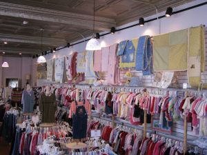 Since you’re a talented, sagacious and observant consignment, resale, or thrift shopkeeper, I know you’ve already clicked on the photo to see it larger and noticed that Terri also has not only glass shelving above the top rack of clothes, but in between the racks as well… so every time there’s a bit of head room available (like the lower right of this photo) she has some room for little sneakers, a basket of bows, a rolled-up-in-a-ribbon bundle of receiving blankets. Here’s another shop’s in between shelf: