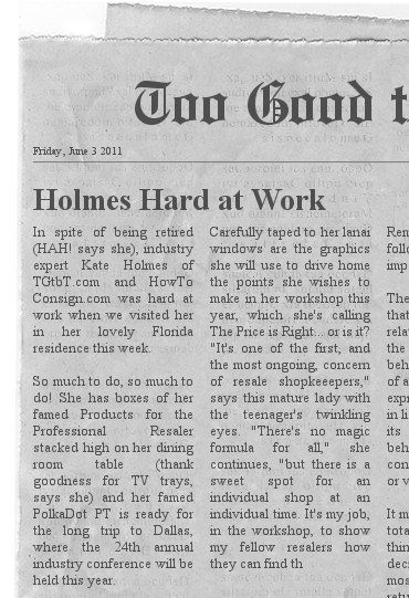 (and if we are talented consignment, resale, thrift shopkeepers as well) we always get the newspaper story we want, written the way we’d want our viewers to read. But that seldom happens. So why not write your own story and use it on your web site, in your blog, or even, if you must, on Facebook?