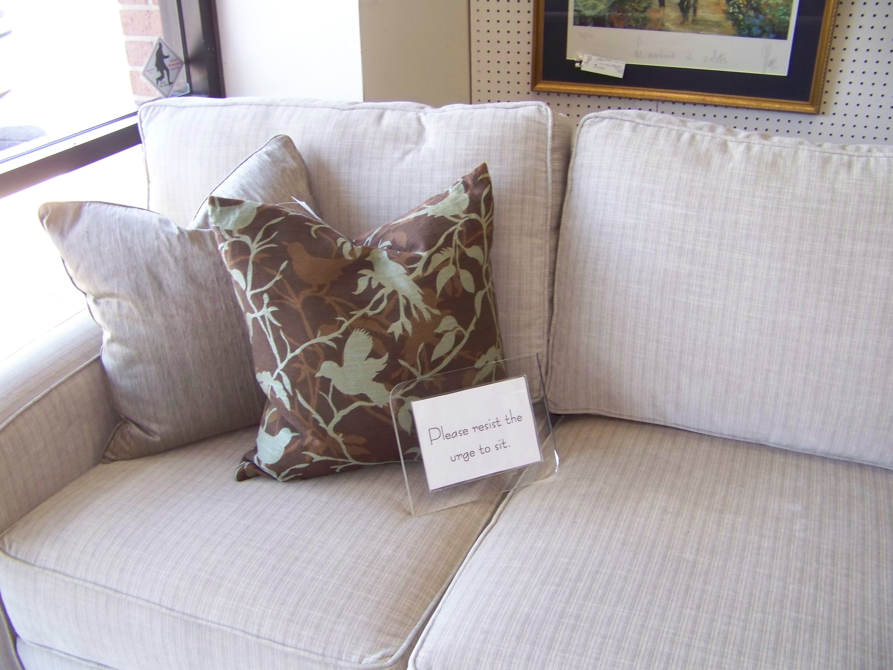 I love the wording’s acknowledgment of how tempting their merchandise is… that you would have to RESIST the urge. Adds to the perceived value of this couch! (Not to mention, it’s different from those “real” stores who cannot think past DO NOT SIT. Courteous and motivating signage sets your shop out from the Dreaded Sea of Sameness that is retail today.)