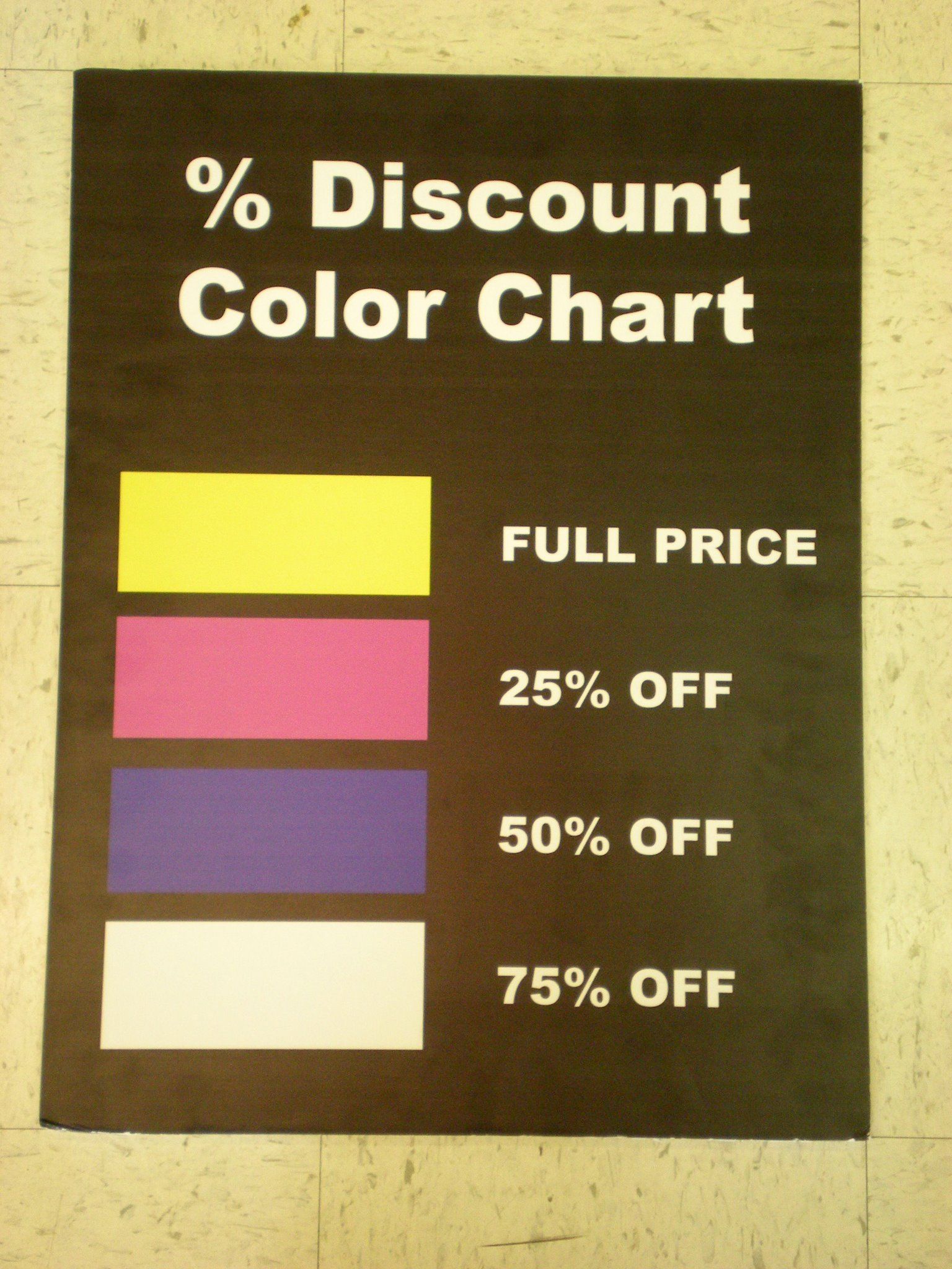 How about, for signage like this, you replace “Full Price” with a simple, motivating phrase like “New Arrivals“? And the DNRs? How about “Boutique Goods” or “Exceptional Values“? That way, your customer doesn’t feel like a sucker when she covets something with “the wrong color tag”?