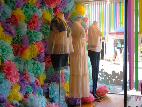 Big platform window dress forms in green green green with pop of yellow! Flat window I have large bright pink and white tissue paper Pom Poms ( like the ones pictured in your picture today) with fun large lettering of the word consignment. The word really pops !