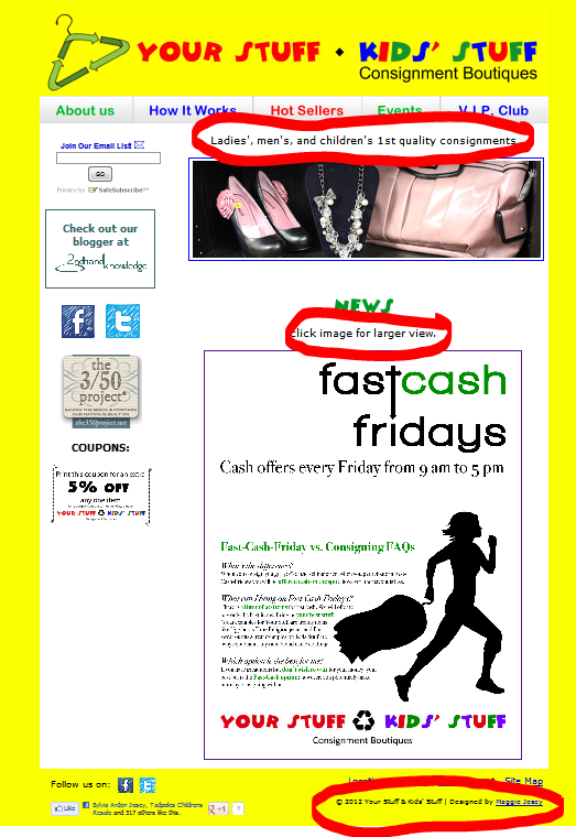 Easy fix #3: Realize that spiders cannot read words in a graphic, so repeat the information in text. Using the same page s an example, only the circled words are readable text to a spider, along with the provided alt text for each image. If there’s something in your graphic “poster” that you think people will search for, be sure to repeat that information in words, as text or part of your alt text. Alt text can’t do the entire job… today, if I google “fast cash friday” only 4 consignment shops come up in the first page of Google results… and none of the four is this shop. I wonder: if the information in the graphic was repeated in the text, would that help? How search engines actually rank sites is a closely-guarded and constantly-changing secret… but I’m willing to say that it couldn’t hurt…