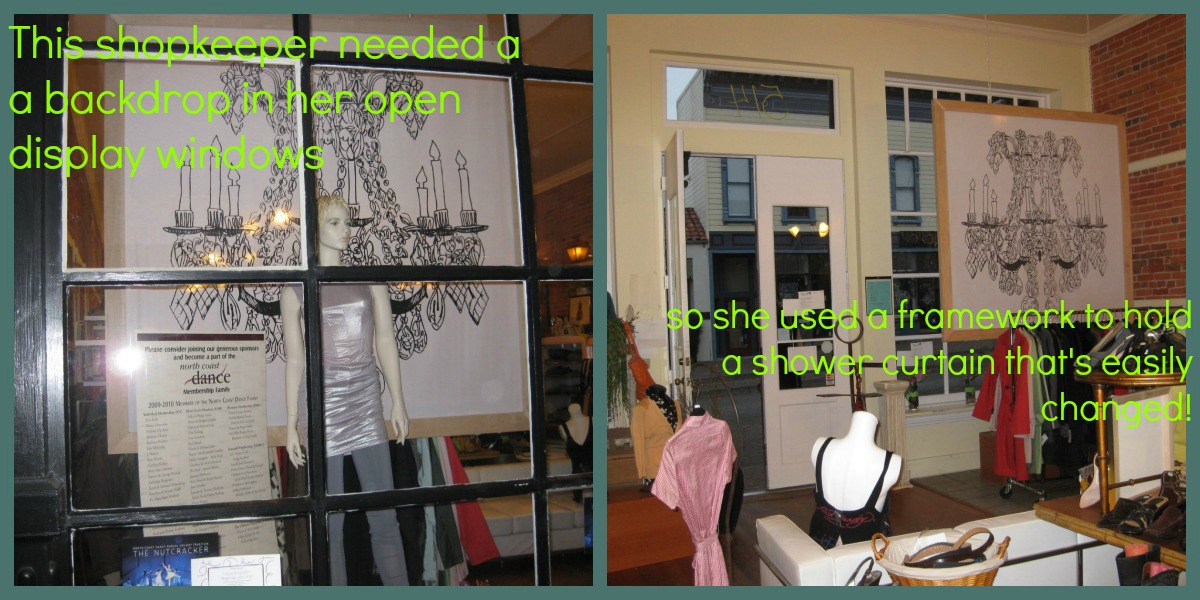 This shopkeeper needed a backdrop in her open display windows. So she had a framework built to hold… a shower curtain! Easily changed, and the availability of different designs and colors meant she could give her windows a different look whenever she wanted. (Thanks KateB, for sending this to TGtbT.com years ago.)