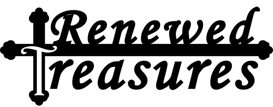 This version of Renewed Treasure’s logo incorporates the Christian cross, since the shop funds missionaries, as well as silhouettes of the shop’s merchandise.