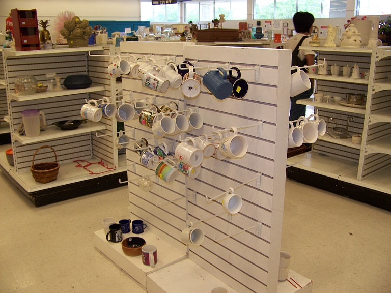 These baskets normally reside in a big dump table in the back of this thrift store, but for our fluffing exercise, we pulled them out, used fabric remnants and for-sale place mats to give some weight to the display, and added a little clock and some brass bookends for textural interest. Lots of appeal, even with low merchandise levels. We didn’t have to move the heavy gondola off the sales floor, and it’ll be ready for next month’s influx of new-to-us goods in a snap!