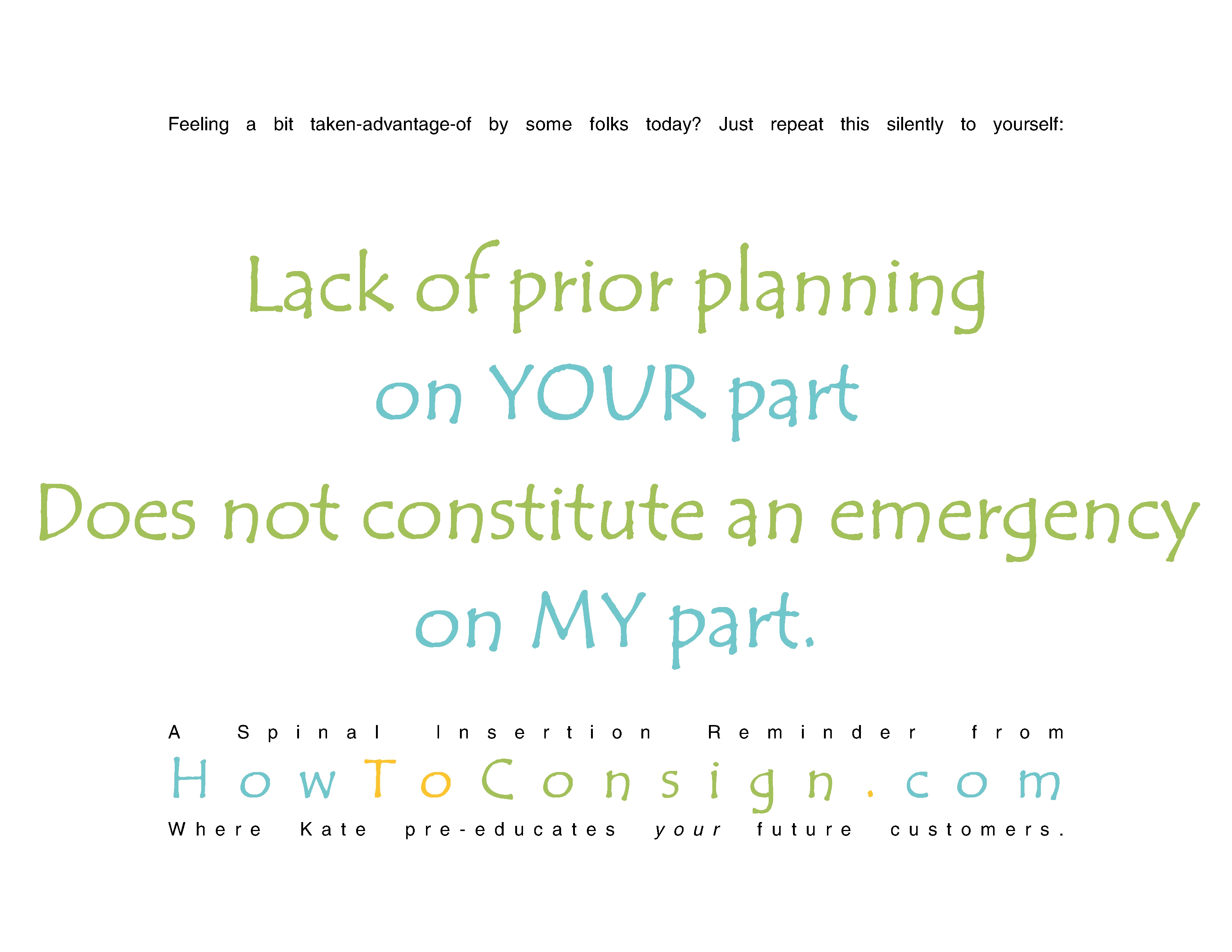 Well, Kate to the rescue. Here’s a nice sign that’ll keep you smiling through the toughest situations in your consignment, resale, or thrift shop.